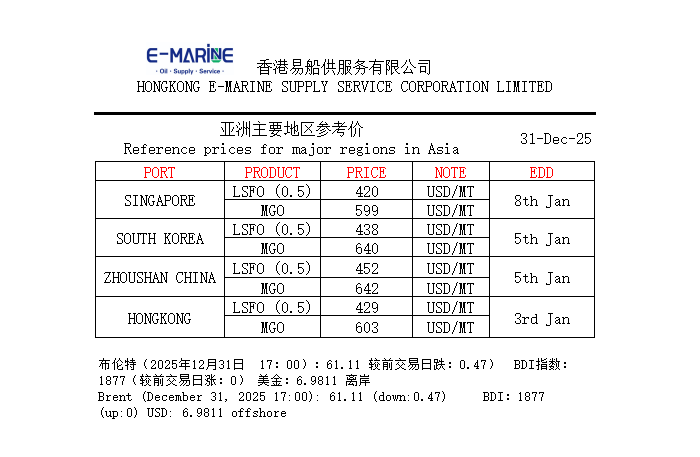 December 31, 2025 Brent ,BDI index,USD offshore exchange rate and our main port reference price