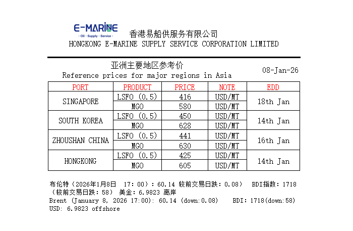 January 08, 2026 Brent ,BDI index,USD offshore exchange rate and our main port reference price