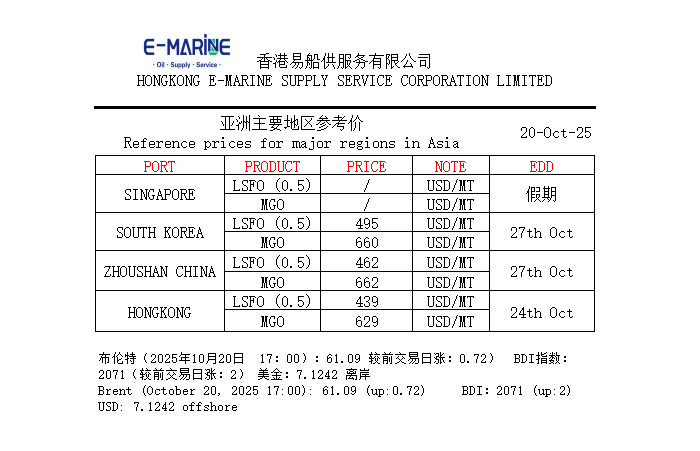 Our reference prices for the main regions of Asia as of October 20, 2025 are as follows2025-10-21