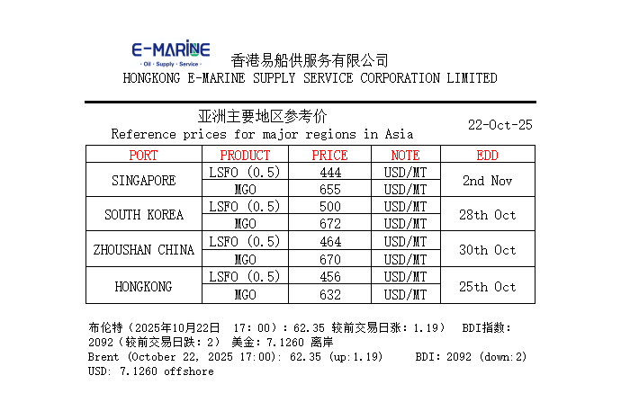 October 22,2025 Brent ,BDI index,USD offshore exchange rate and our main port reference price