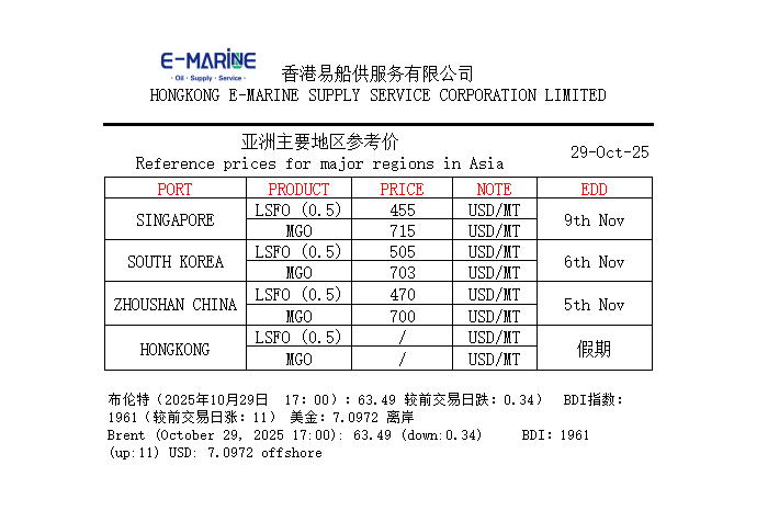 October 29,2025 Brent ,BDI index,USD offshore exchange rate and our main port reference price