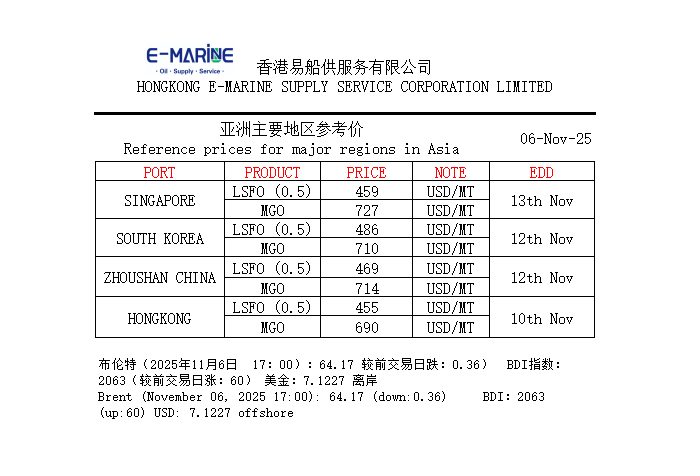 November 06, 2025 Brent ,BDI index,USD offshore exchange rate and our main port reference price